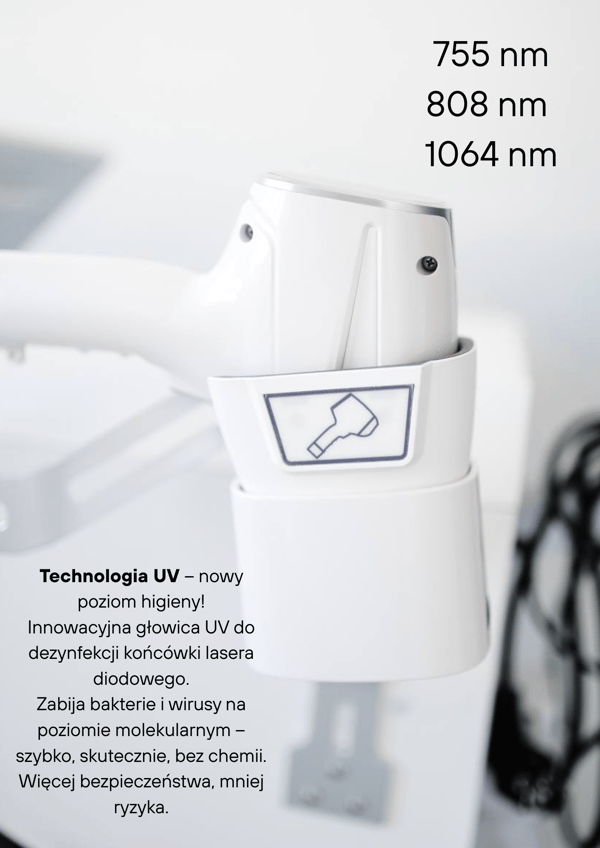 TRINYTY wyposażony jest w dedykowaną głowicę do dezynfekcji, która pozwala na szybkie i higieniczne przygotowanie lasera do pracy. To rozwiązanie zwiększa bezpieczeństwo zarówno dla personelu, jak i pacjentów, oraz spełnia wysokie standardy sanitarno-epidemiologiczne.